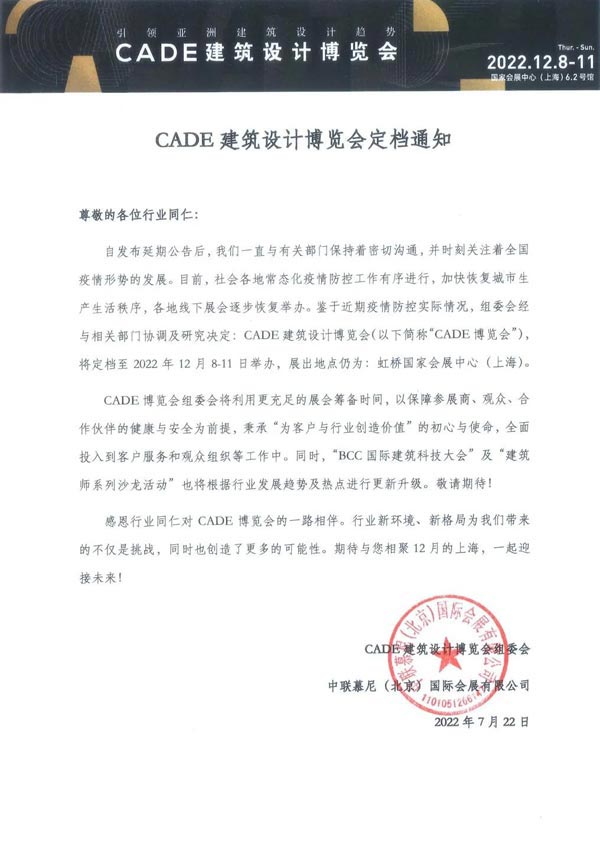 自發(fā)布延期公告后,我們一直與有關(guān)部門保持著密切溝通,并時(shí)刻關(guān)注著全國疫情形勢的發(fā)展。目前,社會(huì)各地常態(tài)化疫情防控工作有序進(jìn)行,加快恢復(fù)城市生產(chǎn)生活秩序,各地線下展會(huì)逐步恢復(fù)舉辦。鑒于近期疫情防控實(shí)際情況,組委會(huì)經(jīng)與相關(guān)部門協(xié)調(diào)及研究決定: CADE建筑設(shè)計(jì)博覽會(huì)(以下簡稱“CADE博覽會(huì)”),將定檔至2022年12月8-11日舉辦,展出地點(diǎn)仍為:虹橋國家會(huì)展中心(上海)。