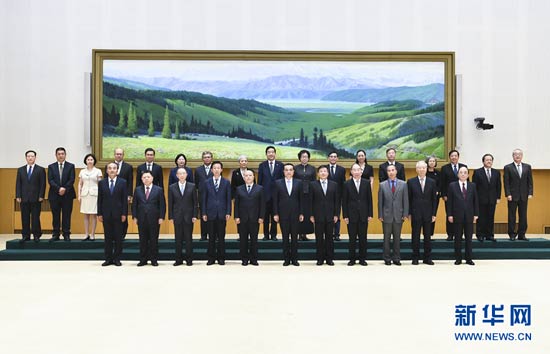 8月19日,中共中央政治局常委、國務(wù)院總理李克強(qiáng)在北京向新聘任的國務(wù)院參事和中央文史研究館館員頒發(fā)聘書。這是李克強(qiáng)與新聘任的國務(wù)院參事和中央文史研究館館員等合影。新華社記者 謝環(huán)馳 攝