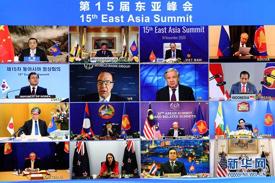 11月14日晚,國務(wù)院總理李克強(qiáng)在北京人民大會堂出席第15屆東亞峰會。會議以視頻形式舉行。 新華社記者 劉衛(wèi)兵 攝