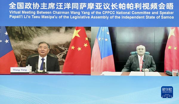 4月19日,全國(guó)政協(xié)主席汪洋在北京以視頻方式會(huì)見(jiàn)薩摩亞議長(zhǎng)帕帕利。新華社記者 劉衛(wèi)兵 攝