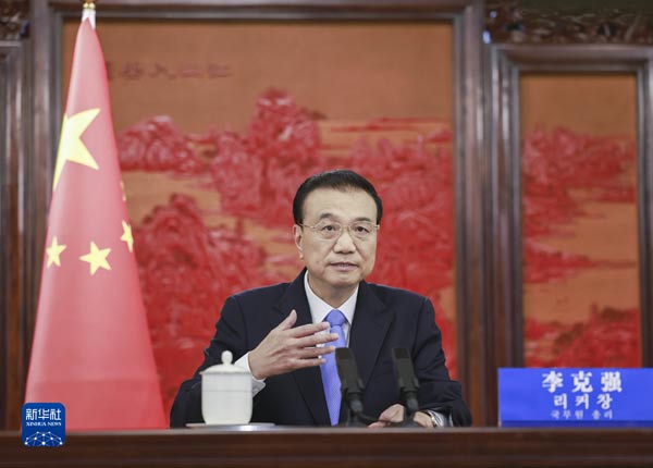 8月24日,國(guó)務(wù)院總理李克強(qiáng)在紀(jì)念中韓建交30周年商務(wù)合作論壇上發(fā)表視頻致辭。新華社記者丁林?jǐn)z