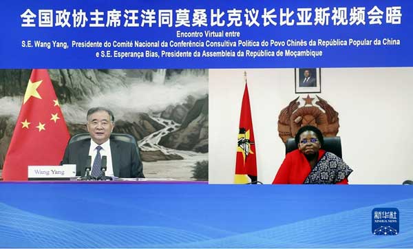9月13日,全國(guó)政協(xié)主席汪洋在北京以視頻方式會(huì)見莫桑比克議長(zhǎng)比亞斯。
