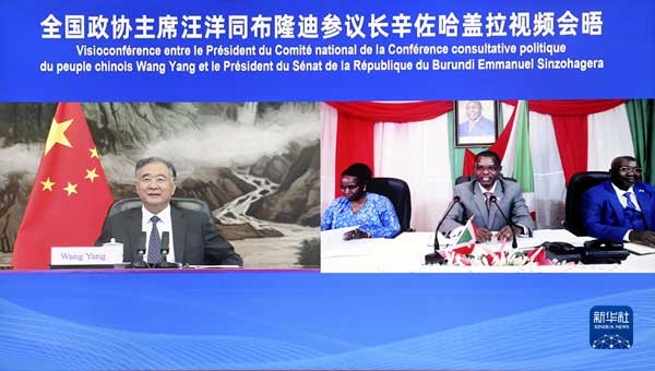 9月13日,全國政協(xié)主席汪洋在北京以視頻方式會見布隆迪參議長辛佐哈蓋拉。 新華社記者 劉衛(wèi)兵 攝