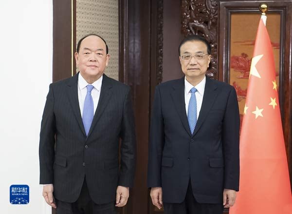 12月22日,國務(wù)院總理李克強在中南海紫光閣會見來京述職的澳門特別行政區(qū)行政長官賀一誠。