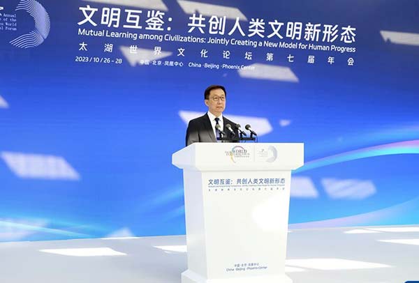 10月27日,國(guó)家副主席韓正在北京出席太湖世界文化論壇第七屆年會(huì)并致辭。