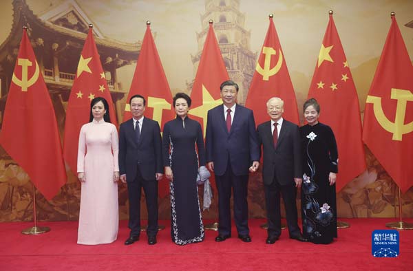 當?shù)貢r間12月12日下午,剛剛抵達河內(nèi)的中共中央總書記、國家主席習近平在越共中央駐地同越共中央總書記阮富仲舉行會談。