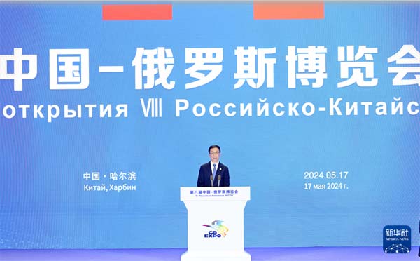 5月17日,國家副主席韓正在哈爾濱同俄羅斯總統(tǒng)普京共同出席第八屆中俄博覽會(huì)開幕式,宣讀習(xí)近平主席賀信并致辭。