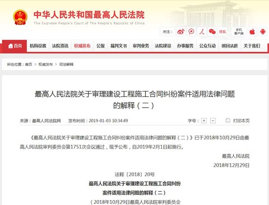 《最高人民法院關于審理建設工程施工合同糾紛案件適用法律問題的解釋(二)》已于2018年10月29日由最高人民法院審判委員會第1751次會議通過,現(xiàn)予公布,自2019年2月1日起施行。