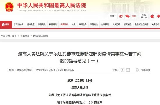 4月20日,最高人民法院公布《關于依法妥善審理涉新冠肺炎疫情民事案件若干問題的指導意見(一)》?!兑庖姟饭彩畻l,涉及充分發(fā)揮司法服務保障,準確適用不可抗力規(guī)則,依法妥善審理合同糾紛、勞動爭議等案件,適用懲罰性賠償,訴訟時效中止和訴訟期間順延,加大司法救助與企業(yè)幫扶等內容。